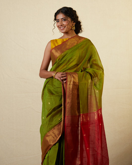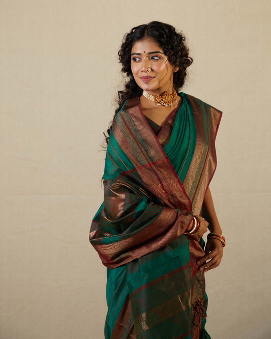 Green Pure Silk Cotton Maheshwari Saree with Gold Zari Border