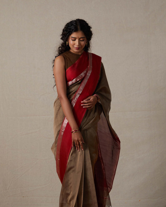 Brown Pure Silk Cotton Maheshwari Saree with Silk & Silver Zari Border