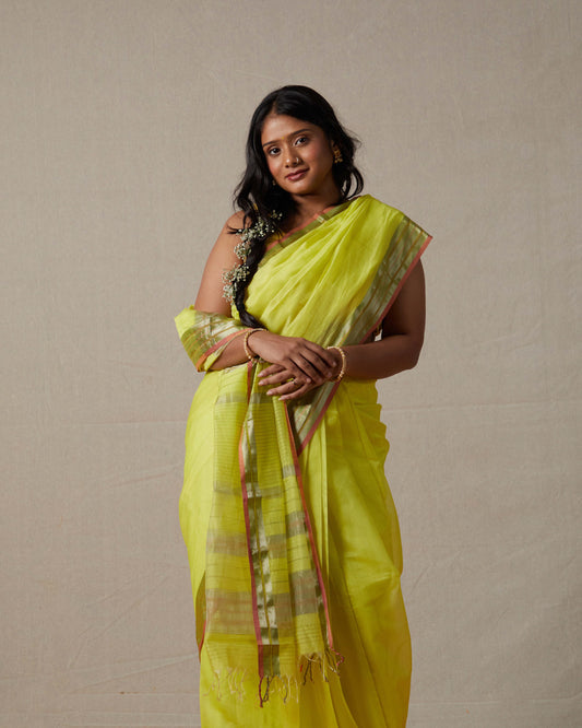Lime Pure Silk Cotton Maheshwari Saree with Silk & Silver Zari Border
