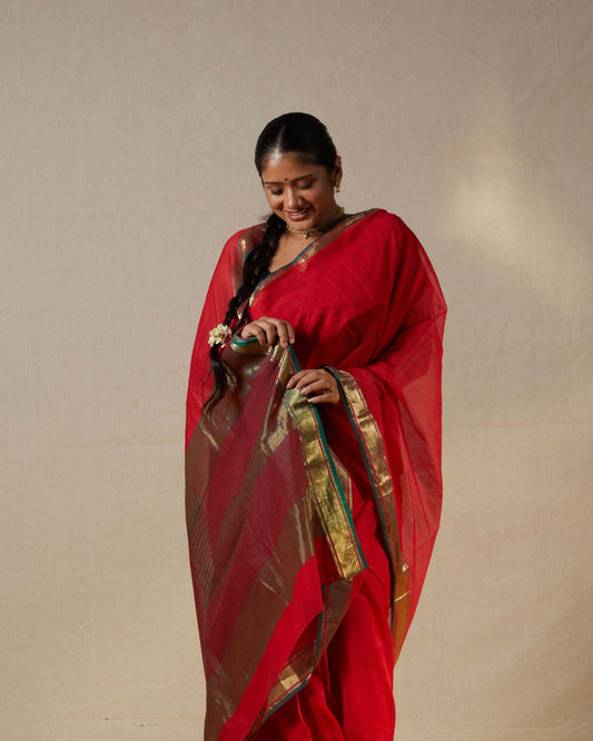 Red Pure Silk Cotton Maheshwari Saree with Gold Zari Border
