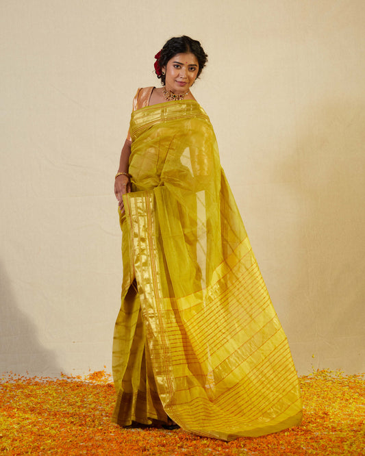 Yellow Pure Silk Cotton Maheshwari Saree with Gold Zari Border