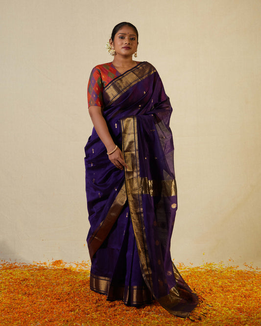 Purple Pure Silk Cotton Maheshwari Saree with Golden Zari Border