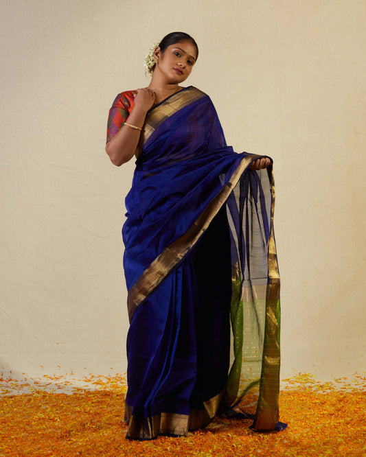 Blue Pure Silk Cotton Maheshwari Saree with Gold Zari Border